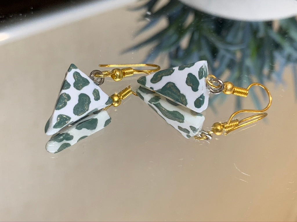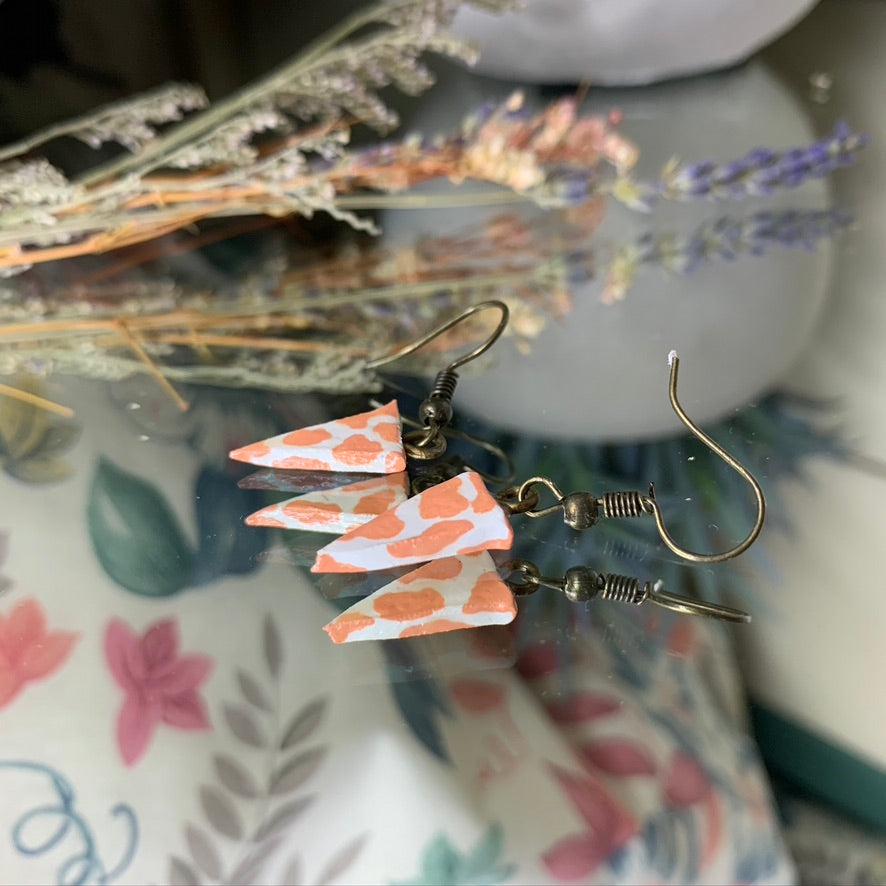 peach coloured cow print on triangular shaped clay, piece shows one's character.